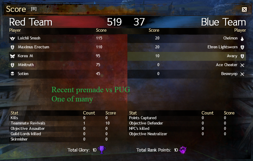 But I still can not ignore why was this game released without any form of MMR? Moreover, who’s idea was it to allow premade teams fight against random pugs? Being completely crushed repeatedly by organized teams, and having absolutely no chance to win is not fun for either team. It’s pointless to even try for the losing team, and the winning team doesn’t learn anything or get satisfaction from such a meaningless win. That kind of a set up does not foster any sort of competitive scene for this game, and it’s honestly quite amazing that ArenaNet intends for it to be an eSport with this incredible lack of support for even the most basic necessities.